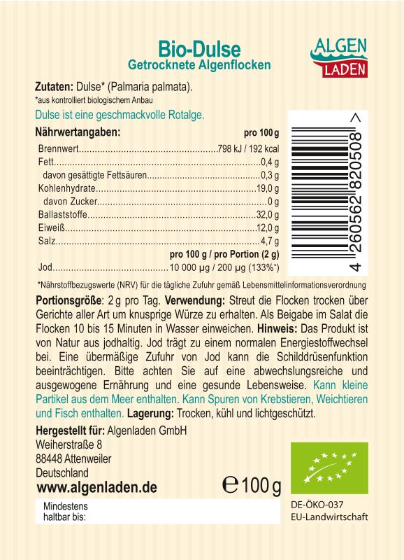 Antwort: Dulse-Algen sind ein Naturprodukt. Bei Dulse-Algen aus dem Atlantik, woher auch die unsere stammt, schwankt der Gehalt im Bereich um ca. 100 µg je Gramm Trockenmasse. Bei einer Portionsgröße von 2 g entspricht dies einer täglichen Aufnahme von 200 µg Jod. Dies sind ca. 133% der Nährstoffbezugswerte (NRV) für die tägliche Zufuhr gemäß Lebensmittelverordnung. Wir empfehlen, Dulse Flakes maximal 4-5x pro Woche zu konsumieren.