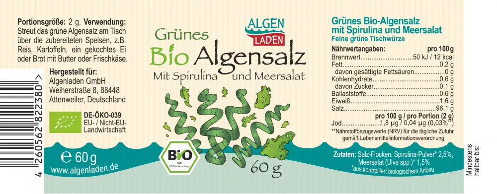 Zutaten Salz-Flocken, Spirulina-Pulver* 2,5%, Meersalat (Ulva spp.)* 1,5% (*: aus kontrolliert biologischem Anbau)