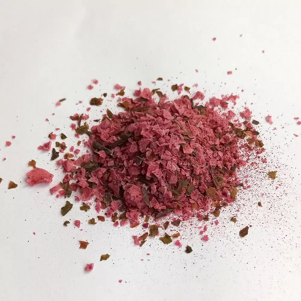 Hier zählt das Zusammenspiel der Zutaten. Salzflocken, Wakame-Algen, rote Bete und Ingwer werden fein abgestimmt und schonend verarbeitet, damit Farbe, Textur und Aroma harmonieren. So entsteht rotes Salz, das intensiv und frisch wirkt, ohne zu dominieren, und euren Gerichten ein dezentes Meer-Aroma verleiht.